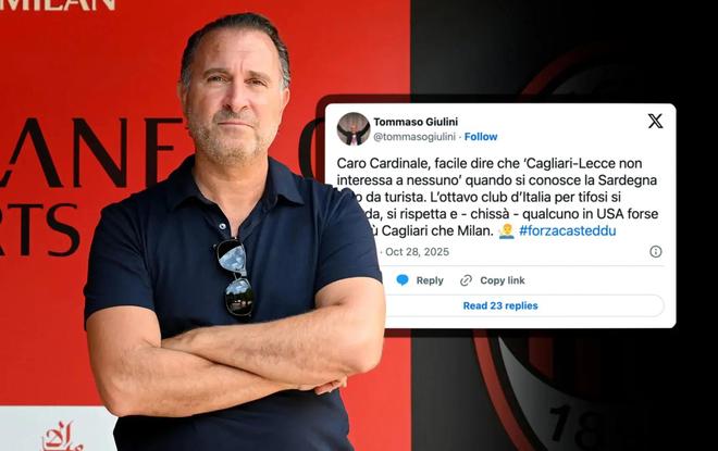 “亲爱的卡迪纳莱,当你只把撒丁岛当成旅游景点时,说‘没人想看卡利亚里对莱切’当然容易。卡利亚里是意大利第八大球迷群体的俱乐部,被关注、被尊重——甚至可能在美国,有人更支持卡利亚里而不是米兰。”